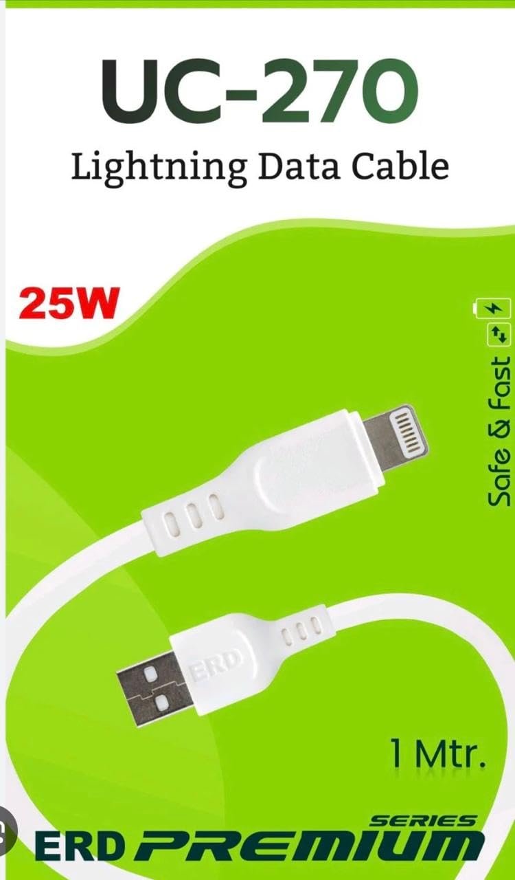ERD UC-270 Flat Lightning Data Cable, 25W Fast Charging, High-Speed Data Transfer, Durable 1m Long, Compatible with iPhones, White