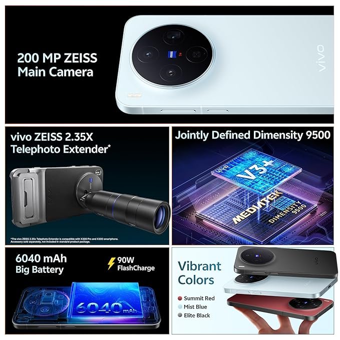 OS OriginOS 6 Product Dimensions 16 x 7.5 x 0.8 cm; 190 g Batteries 1 12V batteries required. (included) Item model number X300 GPS True Special features Basic Phone, Bluetooth Enabled, Built-In GPS, Camera, Dual SIM Other display features Wireless Resolution 1216 x 2640 Form factor Bar Colour Mist Blue Battery Power Rating 6040 Whats in the box Phone Case, Power Adapter, SIM Tray Ejector, Screen Protector (Applied), USB Cable Manufacturer vivo Country of Origin India Item Weight 190 g