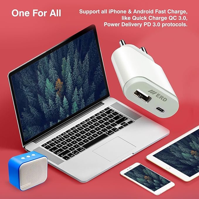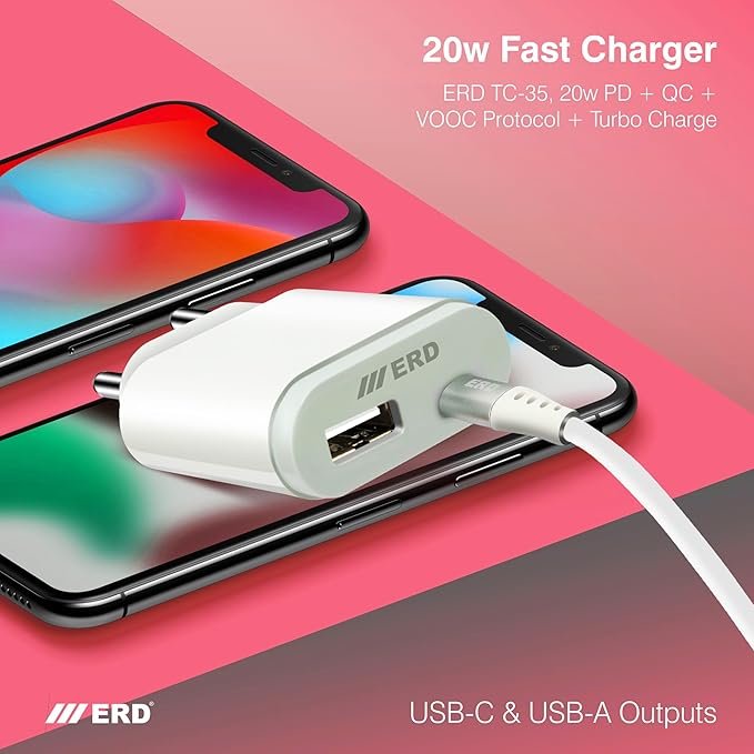 ERD TC 35 20W Fast Wall Charger Adapter (VOOC & PD) Fast Charging Technology | Easy to Carry Dual Output | Universal Compatibility (All iOS & Android Devices) White | 150-240VAC, 50/60 Hz, 0.60A