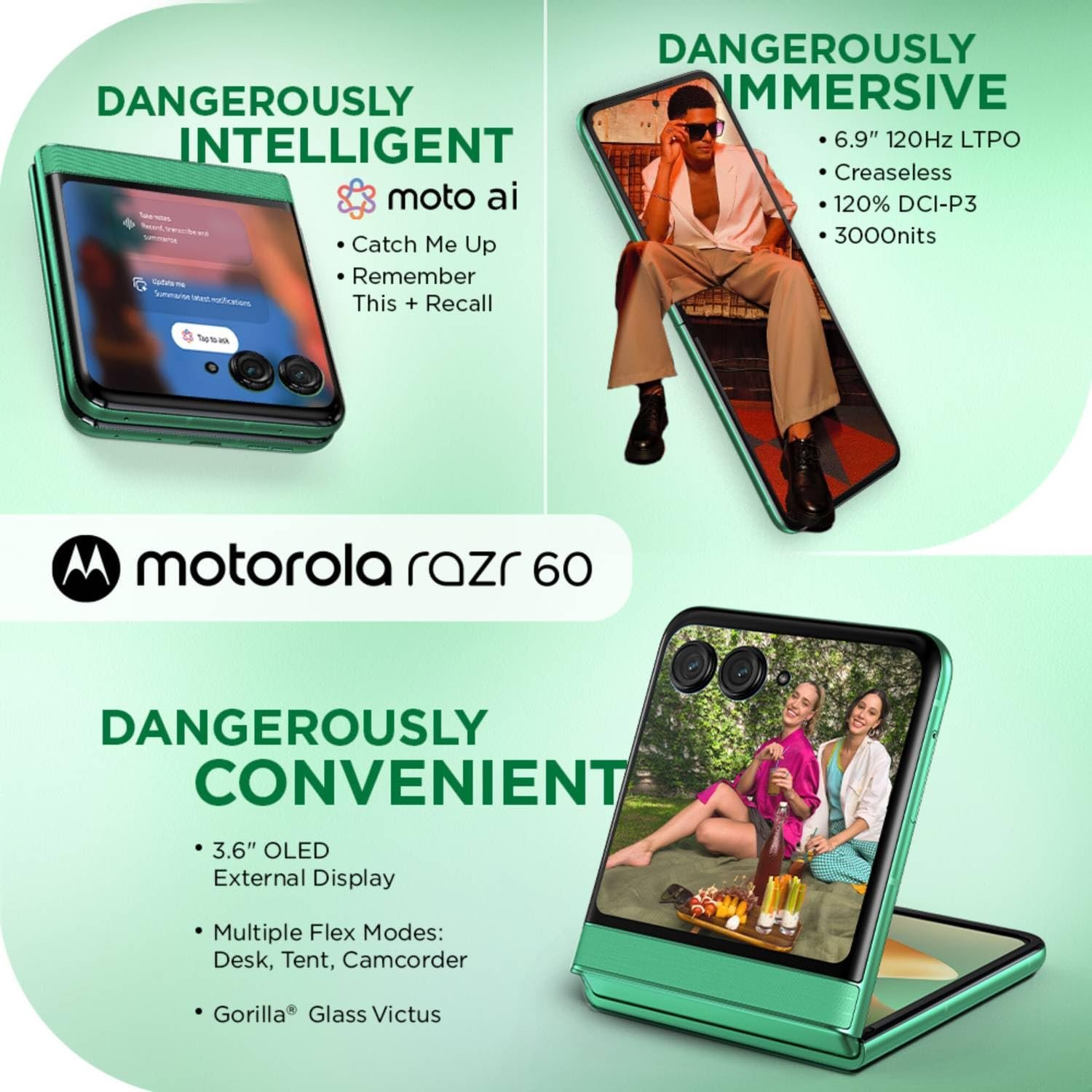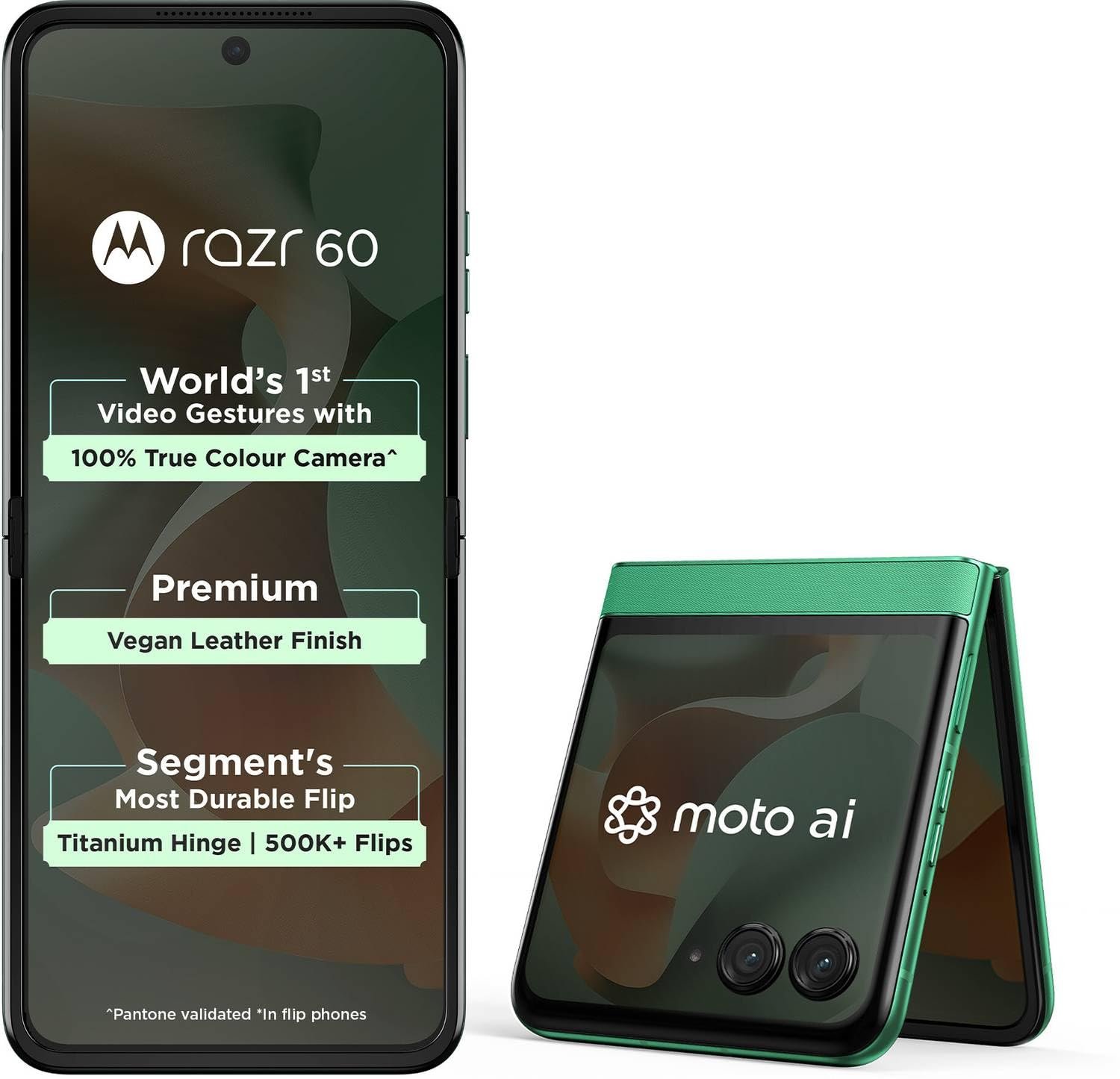 Say hello to the hottest flip phone in town, packed with dangerously cool features that are sure to turn heads. It boasts the world’s first flip with video gestures on an external display, allowing you to record and capture effortlessly with simple hand gestures. Style meets innovation with Pantone-curated colour finishes, including India’s first marble finish, Acetate, the world’s first fabric finish, Nylon-inspired, and a sleek Vegan Leather option. Equipped with motoAI, the phone's advanced camera system lets you capture content in multiple ways.Start, stop, and pause video recording, or even begin a countdown for a selfie using cool video gestures. Raise an open palm to start a countdown for taking a photo or starting a video. To pause while recording, turn your palm into a fist and hold it, then simply open your palm again to resume. To stop recording, show a steady clenched fist, and the video will end after a short countdown.
